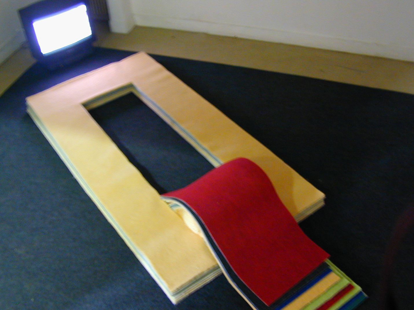 forme une assise, et le dossier est réalisé par le pli, enroulement de la découpe. Chaque morceau de moquette pourrait correspondre à une “Tranche de vie”, sorte de prélèvement éffectué sur le sol de chaque appartement, maison, logement, traversé ou habité. L’empilement de ces morceaux sur le principe d’un mille feuilles, constitue un fauteuil tout aussi bien qu’un matelas, il est aussi à l’image des échantillonneurs de couleur ou de matières. Objet du pli, de l’enroulement, c’est dans son déploiement qu’il se constitue. Le film vidéo installé face au matelas, présente un film de 12 mn, dans lequel un personnage vêtu d’une combinaison jaune “le sujet” se déplace en sautant sur les solives d’un plancher en train de se construire (perte d’équilibre). Le son qui est diffusé en continu et indépendament du film est un refrain grammaticale qui énonce les différentes modalités du comportement du sujet grammatical (à l’image du visiteur en creux et du personnage à la recherche d’une stabilité dans la structure (du texte) et du sol.
